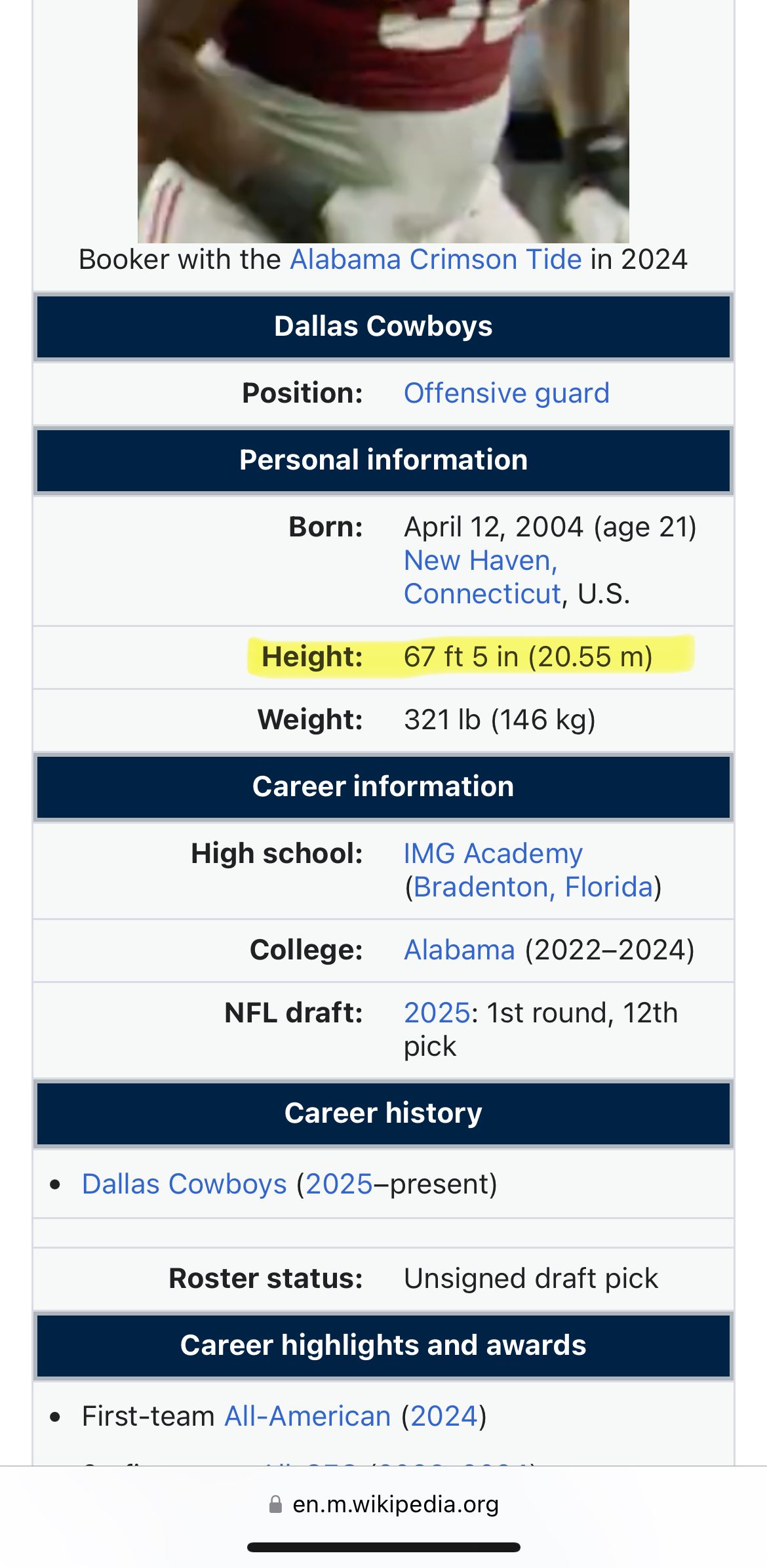 9:27 pm ET — I was secretly hoping the Cowboys would draft Shedeur. Instead, they went with G Tyler Booker. I don’t even know who his dad is. His Wikipedia page has him listed at over 67 feet tall. Big if true.