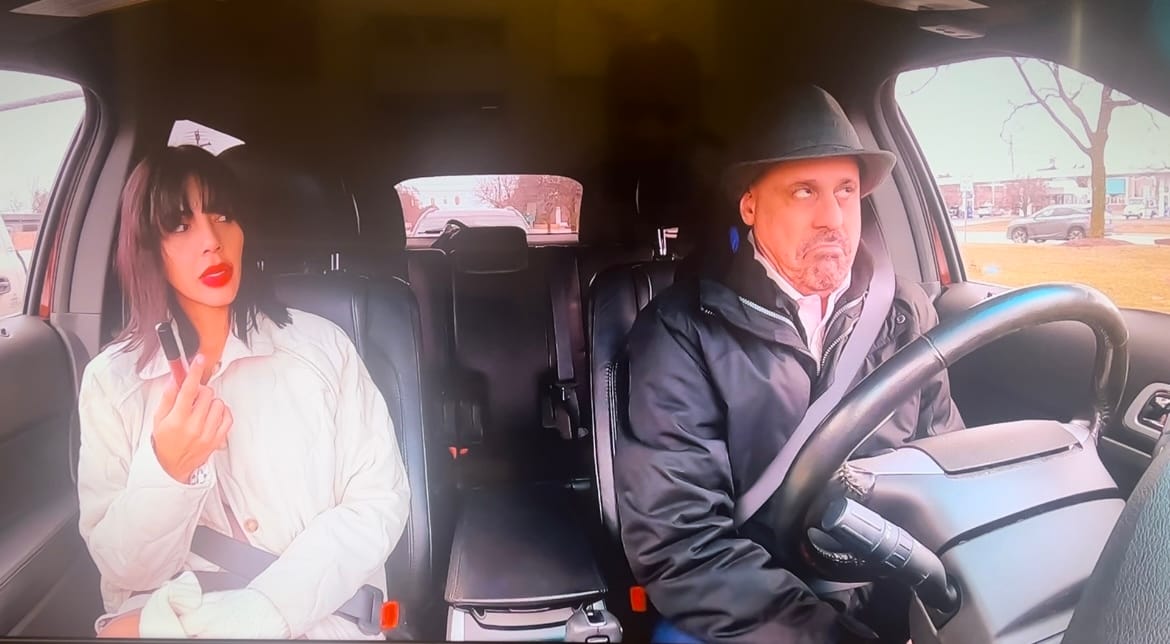 The silence is allowing Jasmine’s imagination to run wild. What started as Gino having an unknown passenger has no doubt progressed to Gino being on a date with a mystery woman to Gino wearing nothing but a fedora and a look of determination as he has this mystery woman folded up in the passenger seat like something you’d see in an Auntie Anne’s display case.