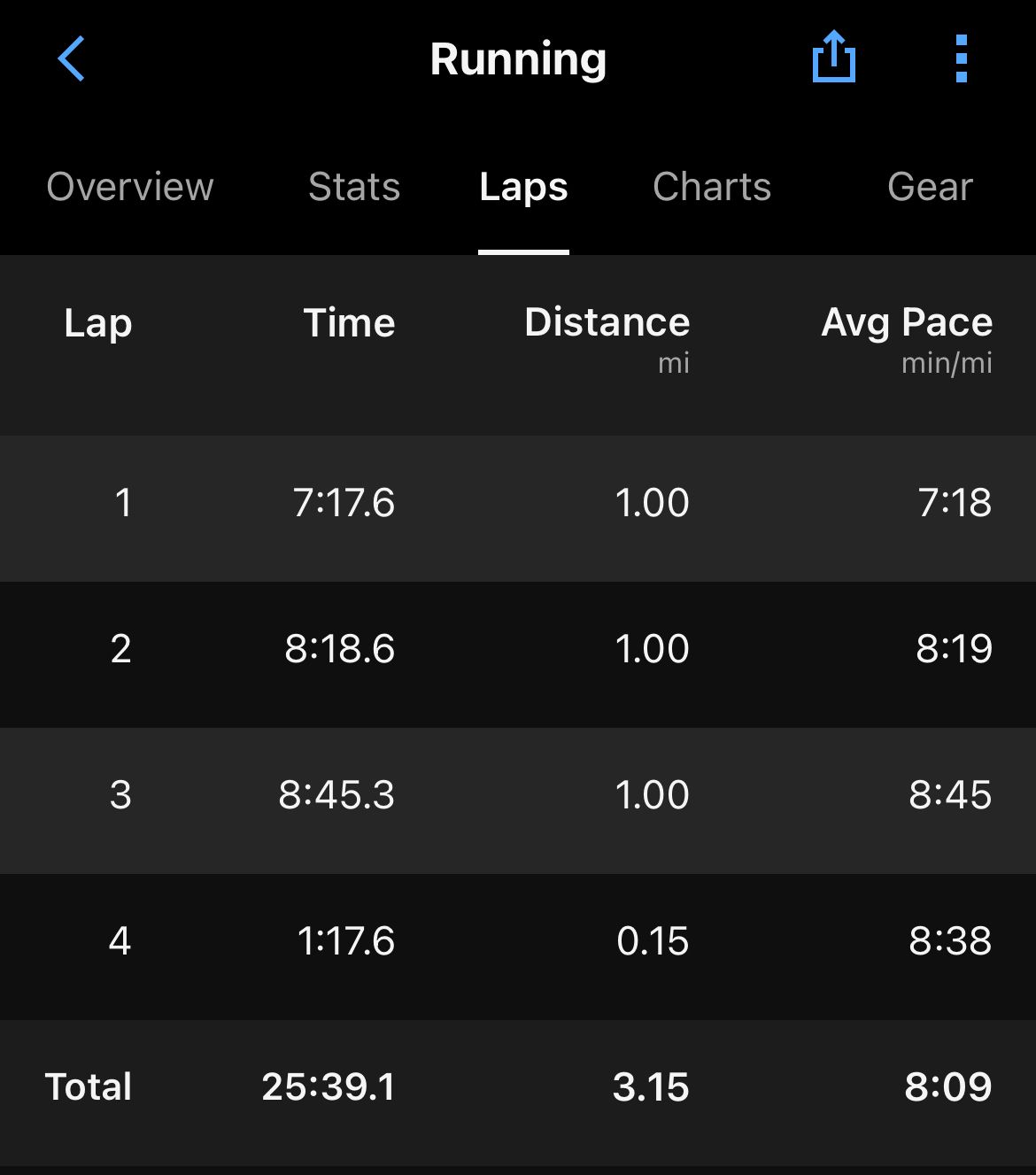 According to my fitness watch, my average heart rate skyrocketed from 147 for mile 1 to 188 for mile 2. This showed up in my split time too, as I ran just over a minute slower. I made a business decision to find a pace that wouldn’t kill me but was also more than a walk. My final mile and change was at an 8:45/mile pace and I finished with a time of 25:39.