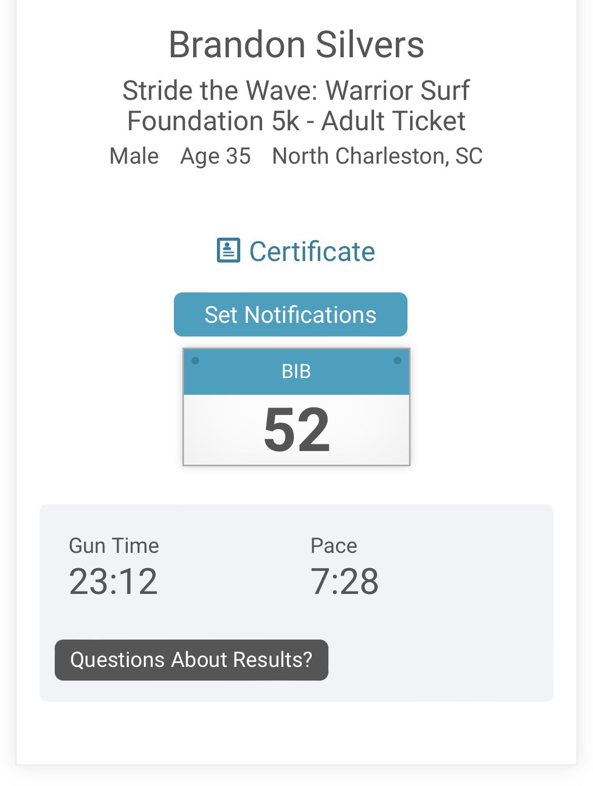 The finish line came into sight, and where I stopped to walk the previous day, I began to kick furiously. I kicked and kicked all the way through the finish line. Race volunteers were yelling out times as runners crossed. “23:12!” they shouted as I broke the plane. A sense of pride washed over me. I grabbed a complimentary water to go along with my cache of drinks I brought and hopped in my car to head home. My thoughts were filled with other races I should run and how low I could get my times.